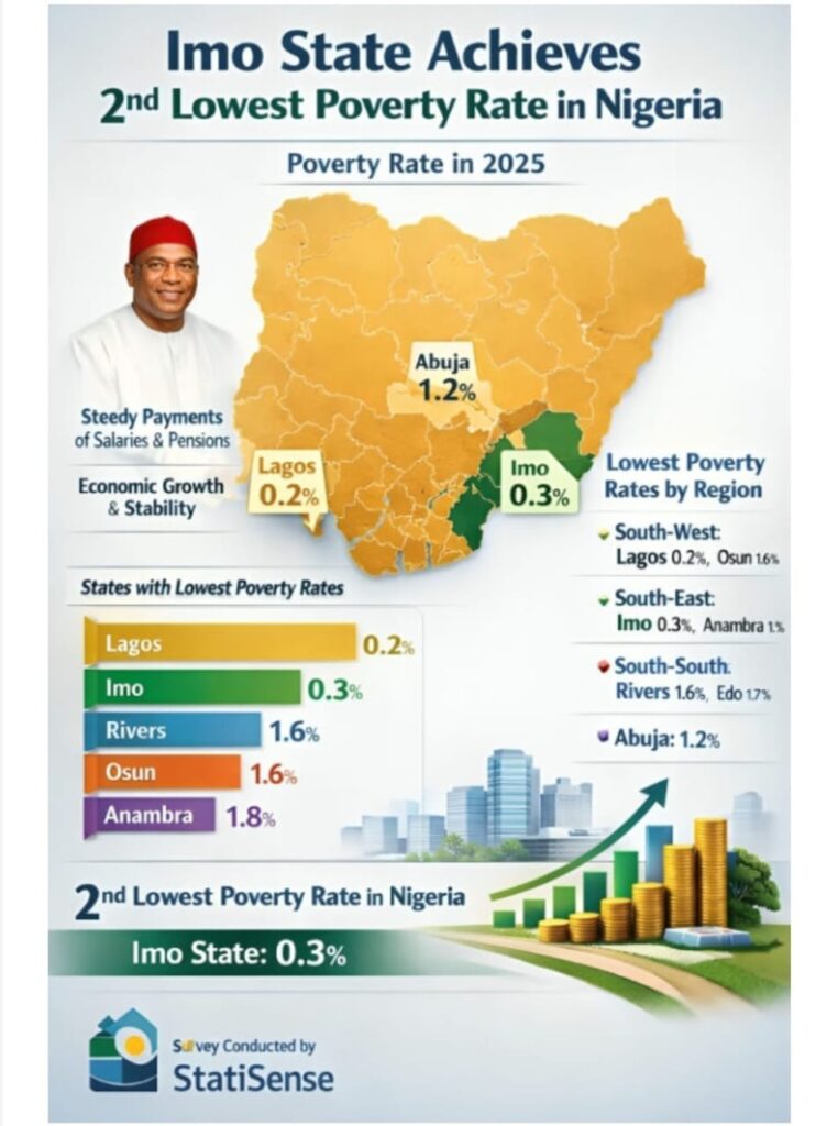 In spite of the global economic headwinds ravaging Nigeria, Imo State has emerged as the state with the second-lowest poverty rate in the country in 2025.