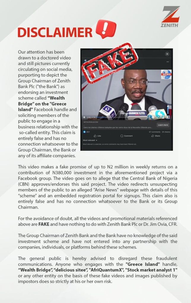 It stressed “For the avoidance of doubt,all videos and promotional materials referenced above are fake and have nothing to do with Zenith Bank Plc or Dr Jim Ovia, CFR.”